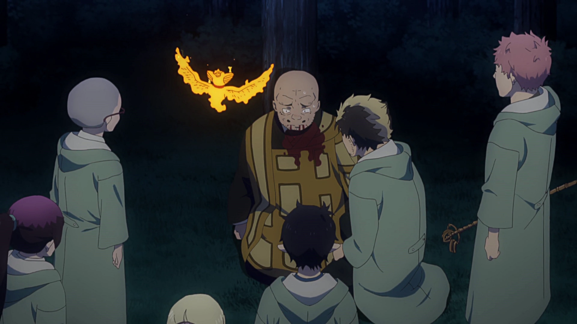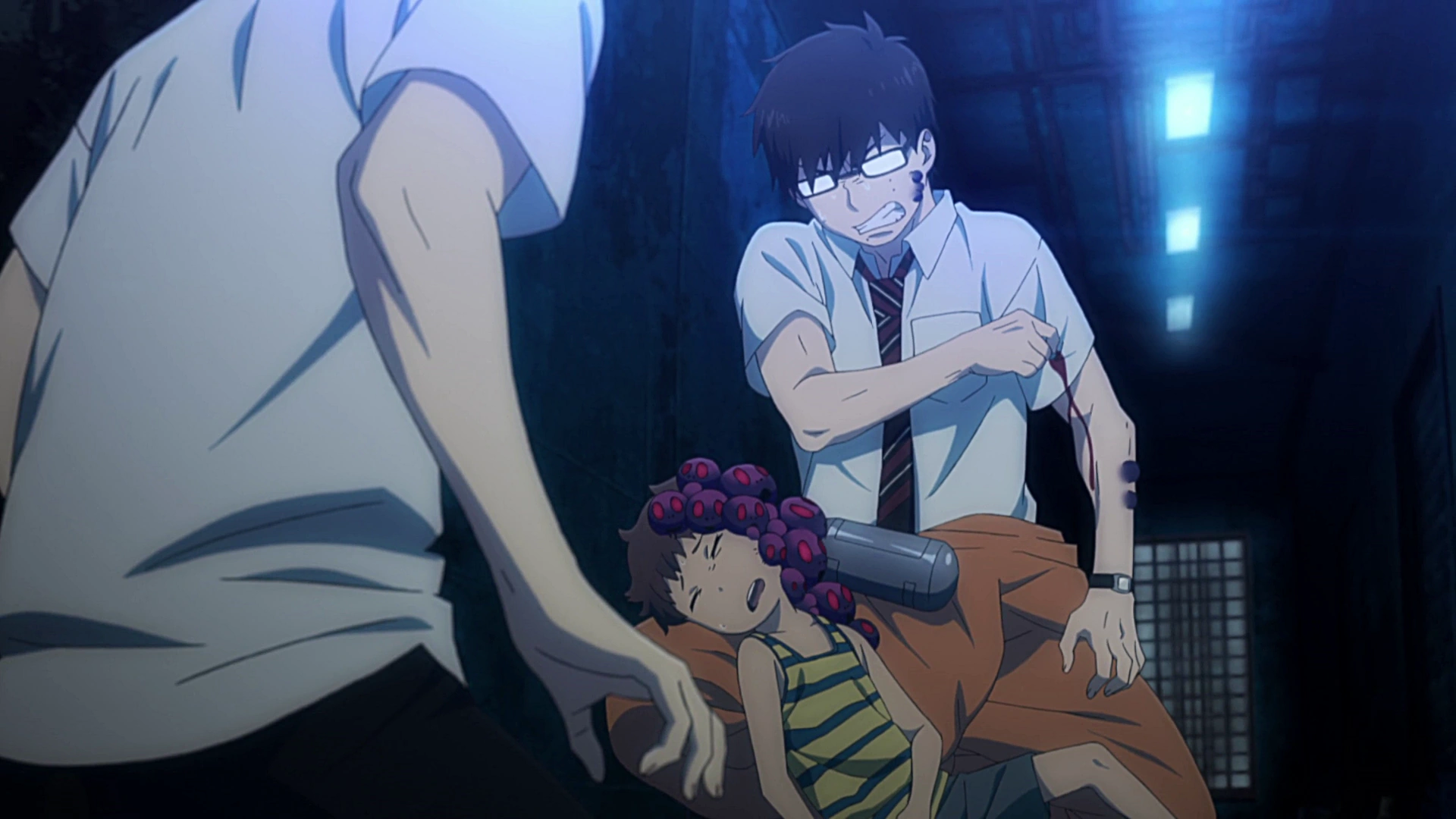 Luego de apagar todas las llamas, Rin empieza a discutir con Ryuji, el cual recuerda que las Llamas Azules solo sirven para matar, y la prueba de ello es la Noche Azul, en donde su abuelo, el hermano de Renzo, el padre de Konekomaru y muchos otros monjes de su templo murieron a manos de Satán. Por ese motivo, Ryuji no puede y nunca confiará en Rin, por ser el hijo de Satán. Rin se defiende diciendo que no tiene la culpa de lo que pasó, y le pide que no lo compare con Satán. Konekomaru intenta separarlos por miedo a que Ryuji corra peligro, cuando de pronto, un Bariyon los ataca, pero Shura lo derrota con su espada y regaña a los Exwire por actuar como niños pequeños, alegando que deben aprender a trabajar en equipo y olvidar sus diferencias. El viaje continúa bajo un ambiente tenso y silencioso, hasta que finalmente llegan a la Sede de Kioto, en donde son recibidos.[8]
