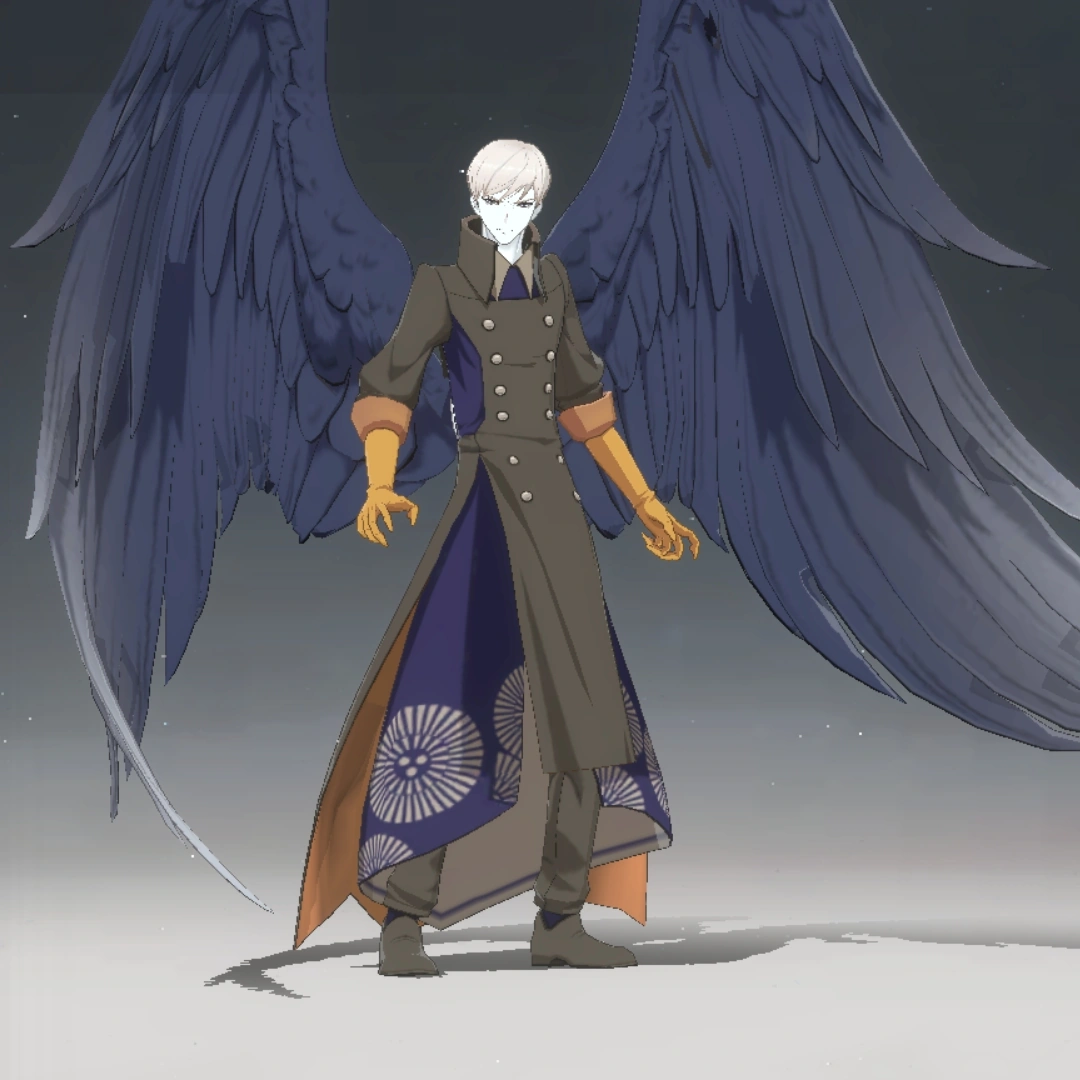 Malphas se presenta como un hombre rubio y pálido, alto y delgado. Luce un par de grandes alas de pájaro oscuras en la espalda. En cuanto a su vestimenta, viste un abrigo largo marrón oscuro con forro naranja, un tabardo azul oscuro con patrones de fuegos artificiales en el dobladillo, pantalones y botas oscuros del mismo color que su abrigo y un par de guantes largos amarillos que le llegan hasta los codos.